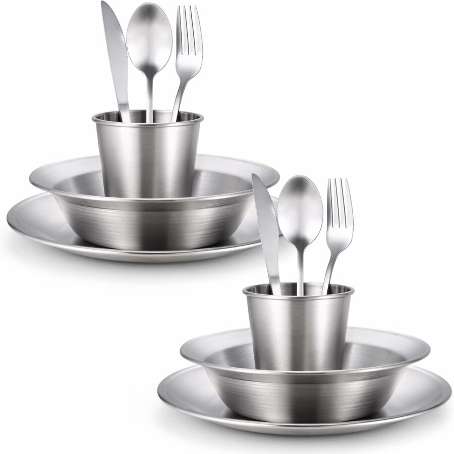 Camping Complete Messware Kit, Polished Stainless Steel Camp Dinnerware, Camping Cooking Tableware, Cutlery Organizer Utensil with Plates and Bowls Set for Backpacking, Hiking, Picnic