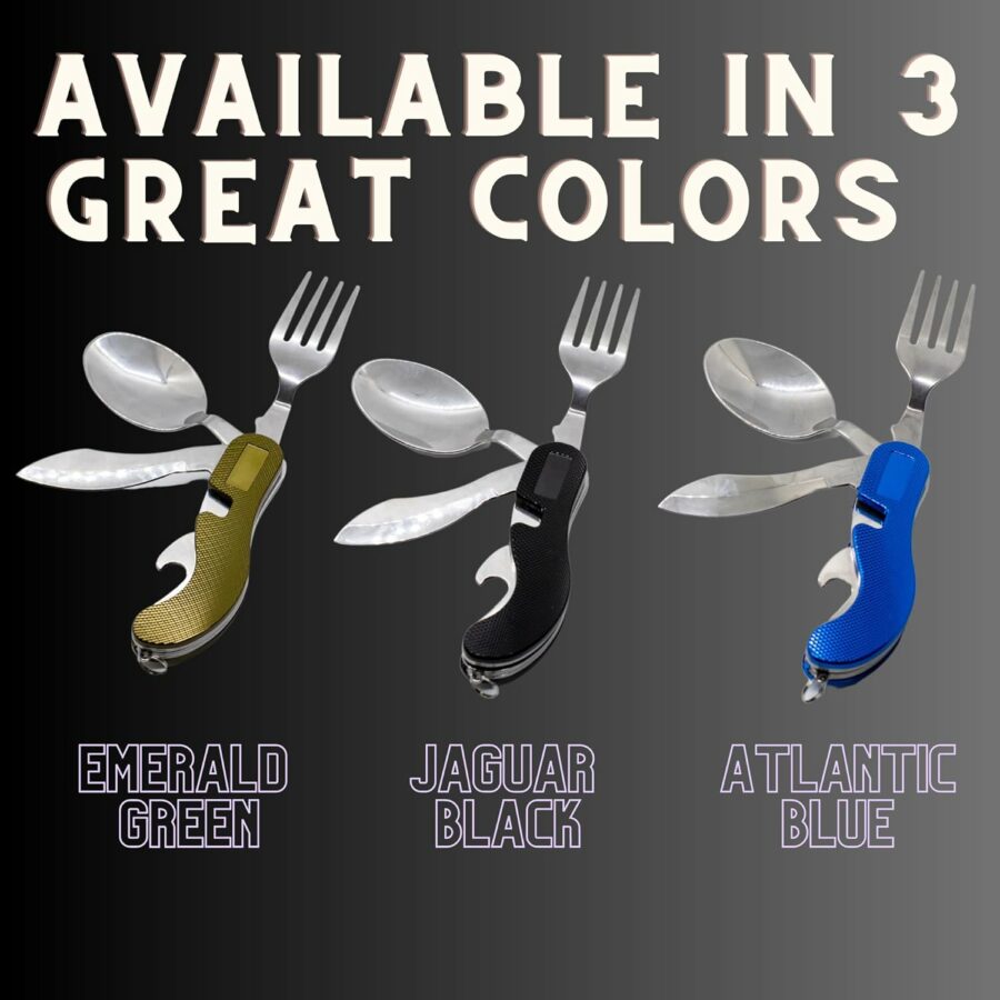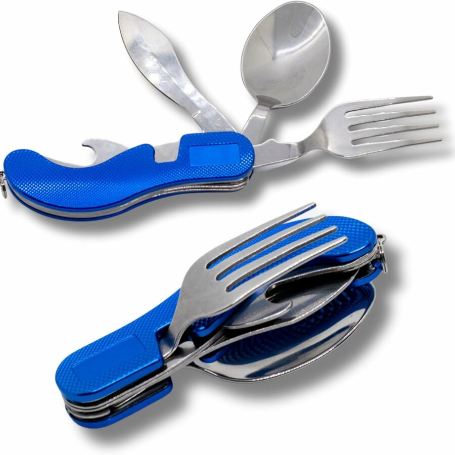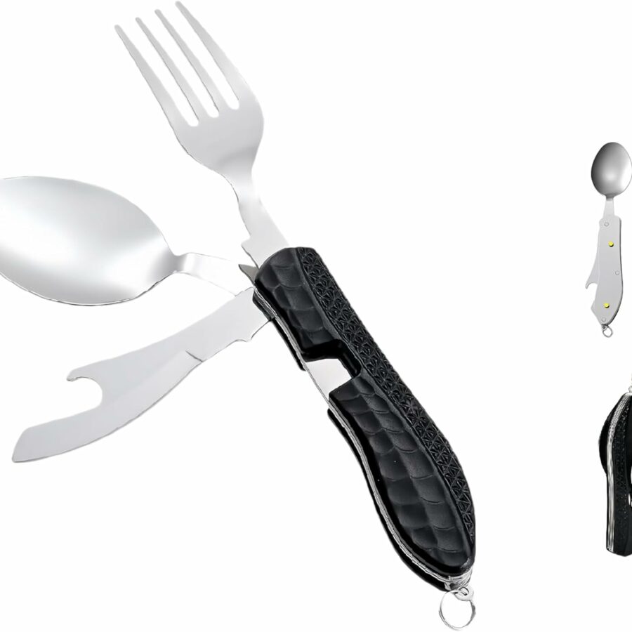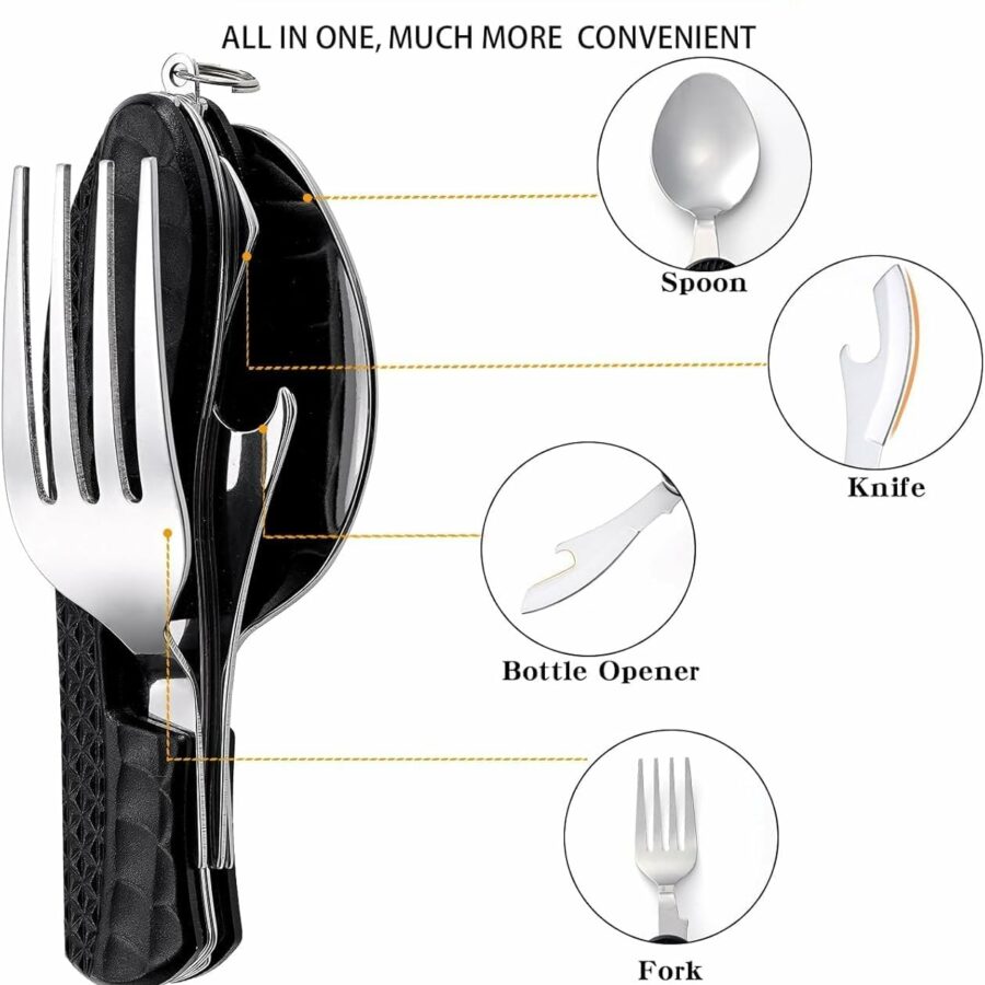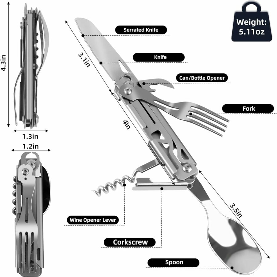 Portable 5-in-1 Camping Utensils – Detachable Travel Utensils Flatware Set – Compact Camping Multitool With Spoon, Fork, Knife, Bottle Opener – Great for Outdoor Adventures (Stainless Steel)