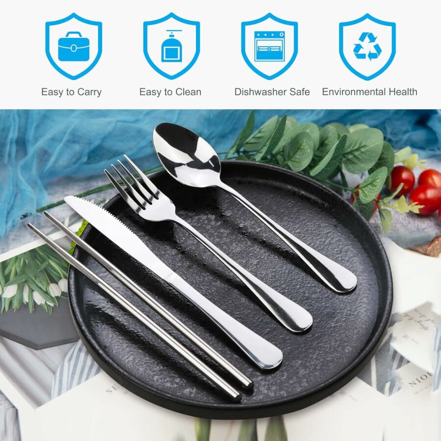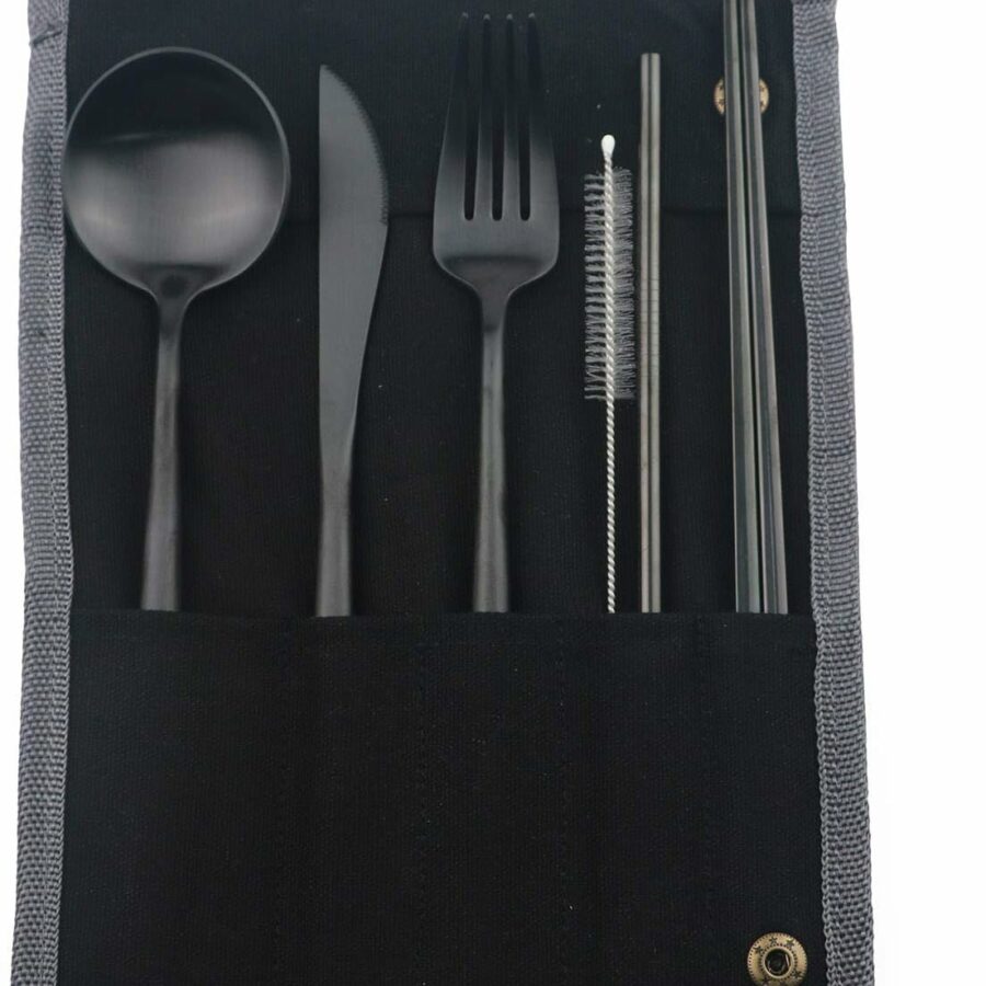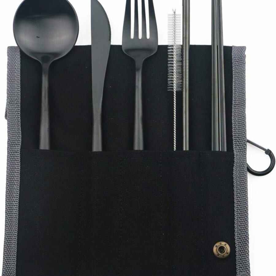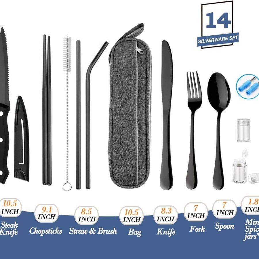 Stainless Steel Portable Reusable Travel Utensils with Case – Flatware Cutlery Set, Chopsticks, Straw – Black