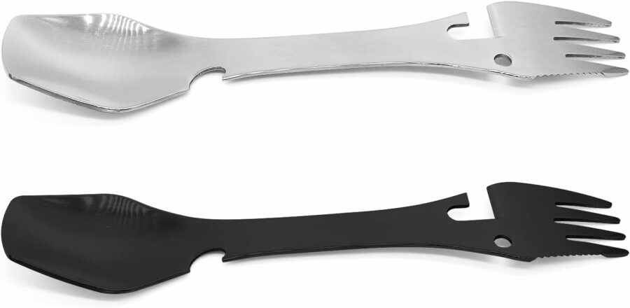 - 5-in-1 Cutlery: Serrated combo of a spoon, fork, cutter, bottle, and can opener, helps you get rid of a series of single flatware and complex tableware wash.