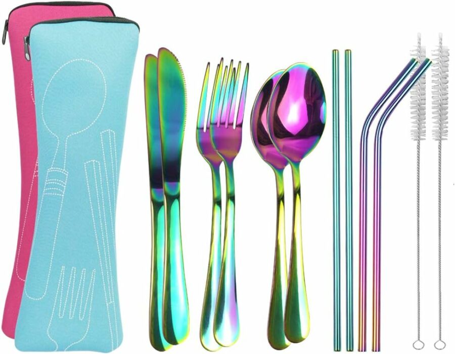 - 2 Set Portable Utensils, Reusable Stainless Steel utensils cutlery set with Case, each set includes 1 knife, 1 x fork, 1 x spoon, 1x straight straw, 1x bent straw,1 x metal brush, packing together with a portable bag