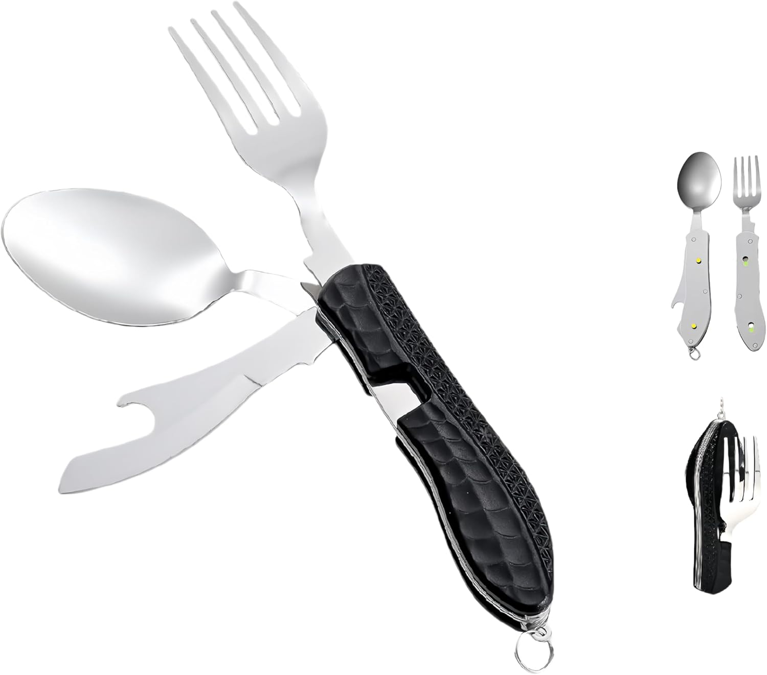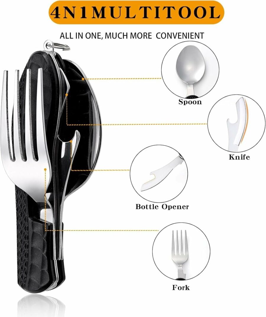 - 4-IN-1 MULTI-FUNCTION – Fork/1-part, Spoon-knife-bottle opener/1-part, all at regular size for plesant and decent use. Easy to unfold, detach, fold. Perfect replacement of flimsy disposables plastic cutlery