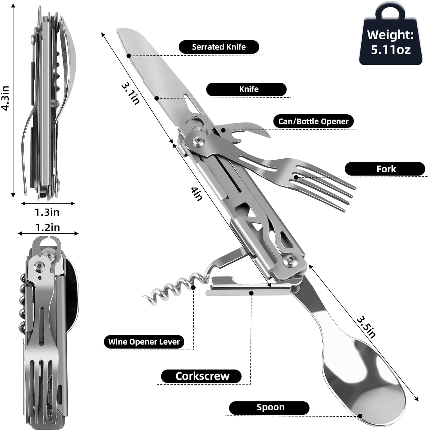- OUTDOOR MULTIFUNCTIONAL TOOL: This portable camping multitool Includes Knife, Fork, Spoon, Wine Corkscrew, Beer Corkscrew and Can Opener. Perfect for camping, traveling, backpacking, picnic, hiking and more scenarios to use