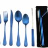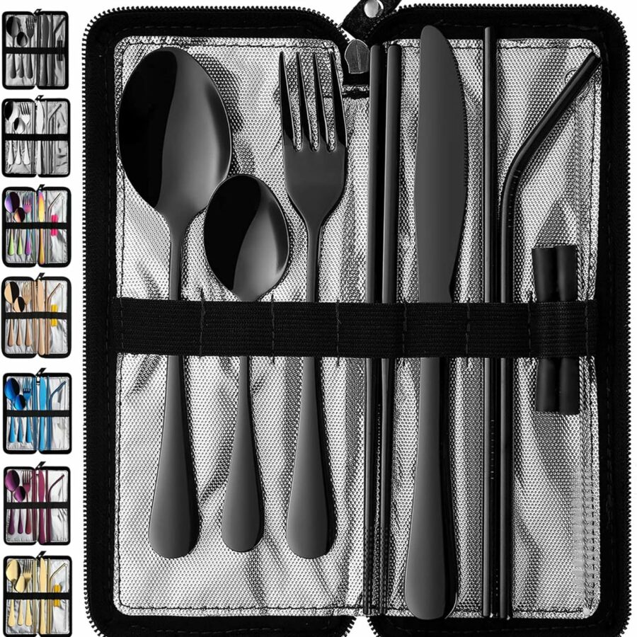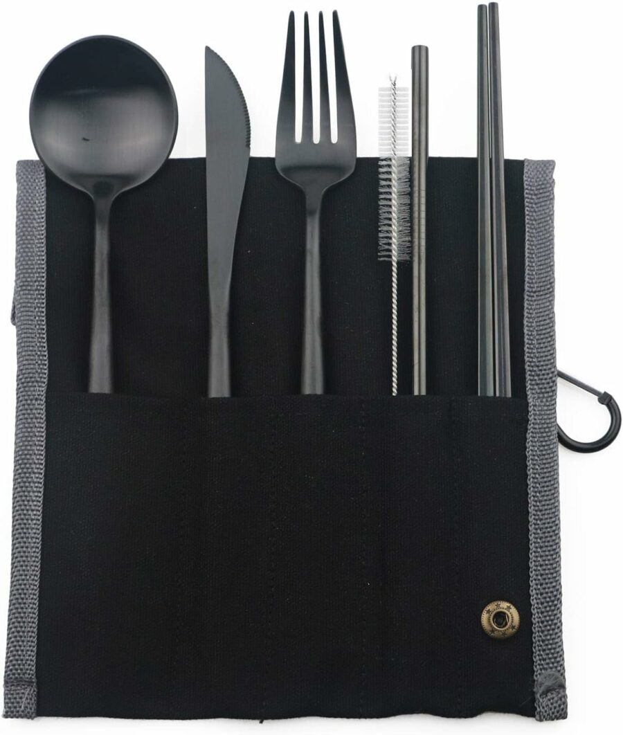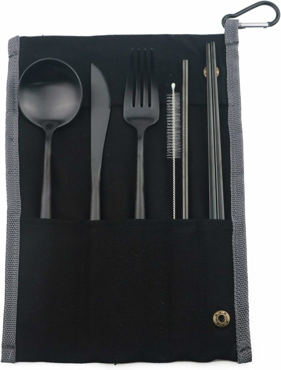 - The 6-pieces portable silverware set includes: matte dinner knife, fork, spoon, mirror chopsticks, straight straw, straw cleaning brush, carrying case. Suitable for travel, camp, school or workplace.