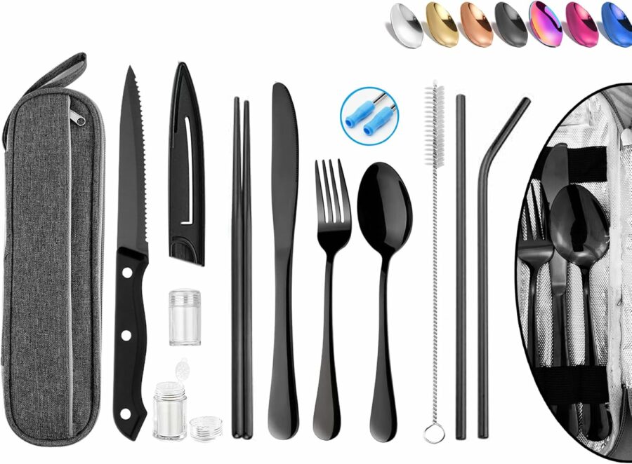 - Portable & Stylish – Not only design for convenience, but also with simple elegance. The adult-sized portable cutlery set fits easily into the modern gray case. Convenient to carry with the tricolor belt and zip up the reusable travel silverware with ease. The sharper knife edge, round designed spoon and super sturdy fork provide you a pleasant experience to use this portable flatware.